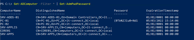 Dans ce cas, on couple l'utilisation de Get-ADComputer et Get-AdmPwdPassword, comme ceci :