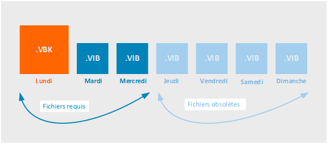 Imaginons une sauvegarde qui se déclenche pour la première fois le lundi, et qu’elle se poursuit jusqu’au dimanche (une fois par jour). Une fois que l’on se trouve au dimanche, on se rend compte que l’on souhaite restaurer l’état au mercredi, cela sera possible avec le logiciel VEB. Attention tout de même, vous devez posséder bien entendu le fichier de sauvegarde complète (VBK), mais aussi les fichiers VIB de lundi, mardi et de mercredi.