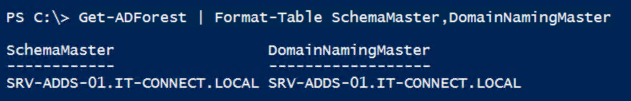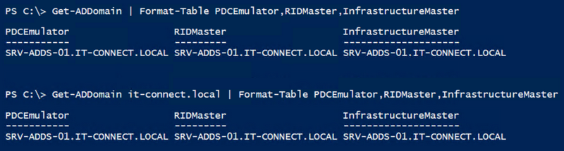 Get-ADDomain it-connect.local | Format-Table PDCEmulator,RIDMaster, InfrastructureMaster
