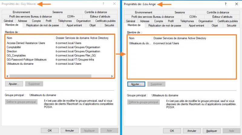 Nous souhaitons que l'utilisateur "Lou Ange" soit membre des mêmes groupes que l'utilisateur "Guy Mauve". Actuellement, nous pouvons que ce n'est pas le cas. Plutôt que d'ajouter les groupes un par un, ce qui peut être très long s'il y a de nombreux groupes, nous allons solliciter l'aide de PowerShell.