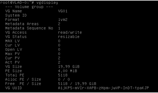 On voit alors le nom du groupe de volume ainsi que son format. Une donnée très intéressante sur laquelle on reviendra ultérieurement, concerne champ metadata, servant à afficher le nombre de volumes physiques intégrés au groupe de volumes. On dispose également de la taille totale ainsi que du cumul de la taille de l’ensemble des volumes physiques (d’après l’exemple, 20Gio).