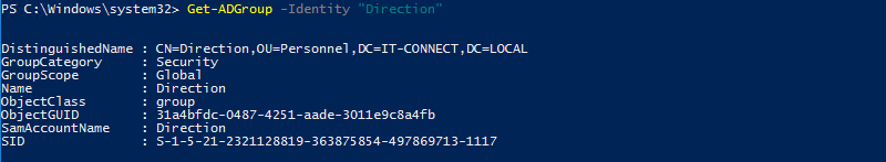 Sa syntaxe est similaire à celle de son cousin « Get-ADUser » et reprend le principe des paramètres « -Identity » et « -Filter » pour filtrer la requête. Par exemple, pour obtenir des informations sur le groupe « Direction », la commande sera la suivante :