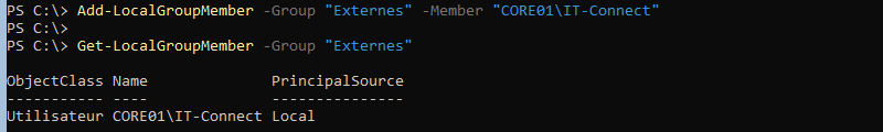 Add-LocalGroupMember -Group "Externes" -Member "CORE01\IT-Connect"