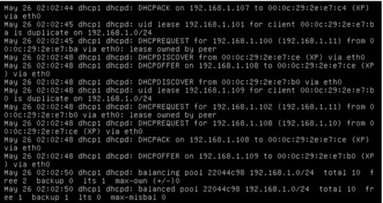 Ici, les deux serveurs DHCP donnent tous les deux des adresses IP aux clients et estiment que certaines sont la propriété de l’autre serveur. Par exemple, le serveur primaire estime que l’adresse 192.168.1.100 appartient par le serveur DHCP esclave : d’où le message "lease owned by peer". Cela s’explique par le fait qu’il doit être pratiqué un équilibrage dans la répartition des adresses, puisque les serveurs doivent gérer autant de baux l’un que l’autre.