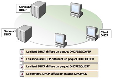 En l’absence de serveur DHCP, le client s’auto-attribue une adresse appelée APIPA (Automatic Private Internet Protocol Addressing) s’appuyant sur la plage 169.254.0.0./16. Sinon, le processus standard de résolution tient dans l’ordre d’exécution des requêtes. On parle de processus DORA (Discover, Offer, Request, Ack) :