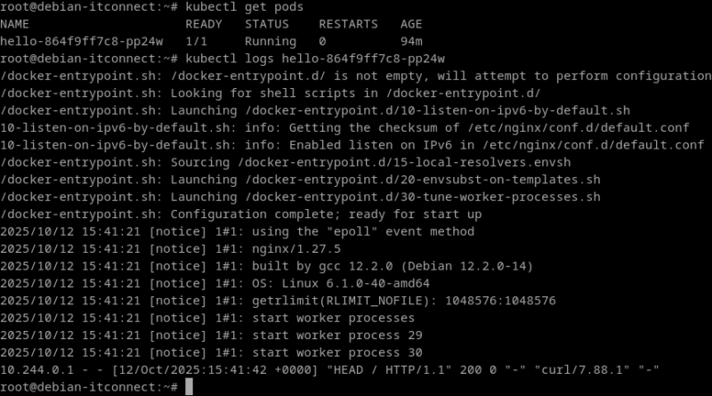 Lorsque le message deployment "hello" successfully rolled out apparaît, cela signifie que Kubernetes a bien programmé le pod sur le nœud, téléchargé l’image depuis Docker Hub et démarré le conteneur.