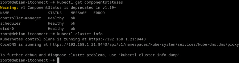 Kubernetes propose plusieurs outils intégrés pour vérifier la santé de ses différents modules. Tout d'abord, la commande suivante affiche un résumé du statut des composants principaux du plan de contrôle :