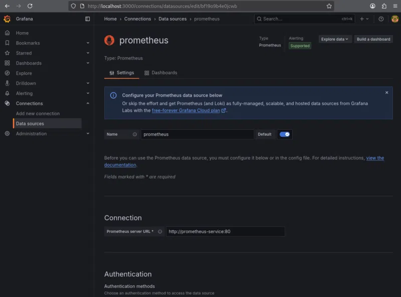 - URL : saisissons l’adresse interne du service Prometheus du cluster : http://prometheus-service:80