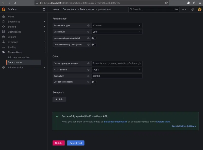 Nous déroulons la page jusqu’à « Save & test ». Si la configuration est correcte, Grafana affiche le message : « Successfully queried the Prometheus API. »