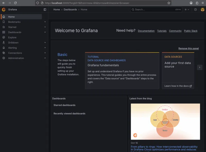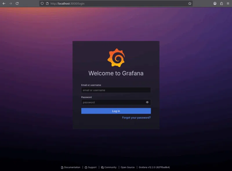 Nous ouvrons alors dans notre navigateur : http://localhost:3000. Nous accédons ainsi directement à l’interface complète de Grafana, sans erreur de chargement.