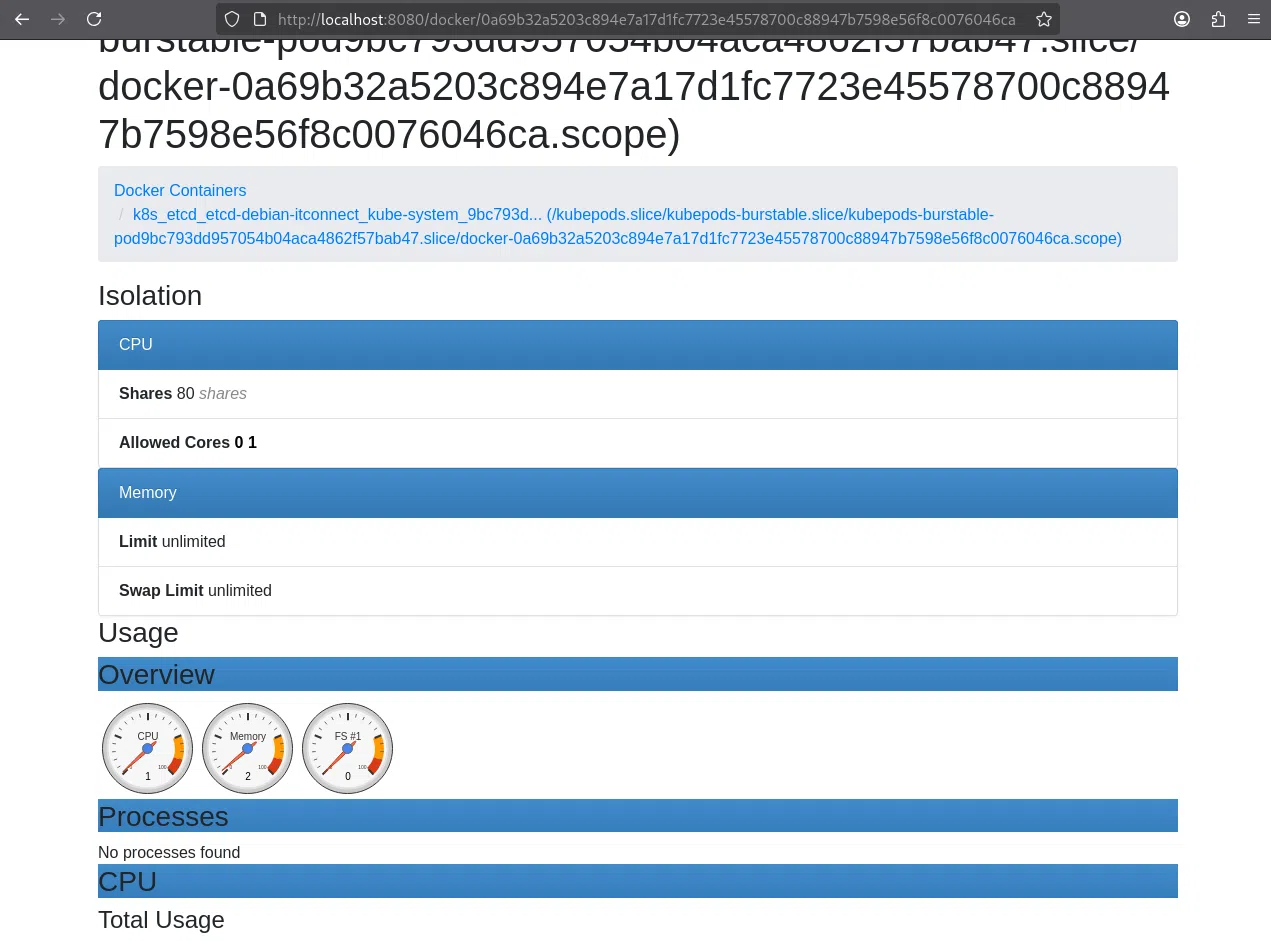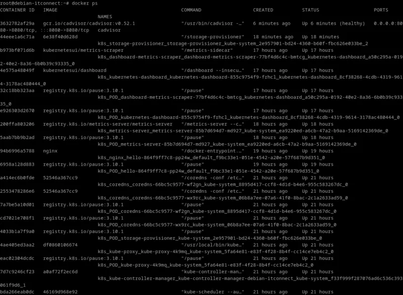 Sur notre machine debian-itconnect, disposant d’un cluster Minikube fonctionnel, cAdvisor peut être activé et visualisé facilement.