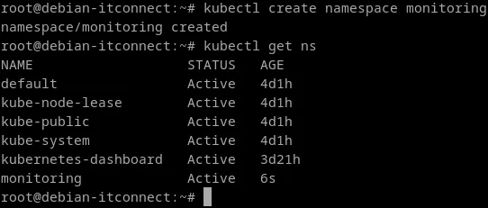 Nous allons donc créer un espace nommé monitoring, qui servira exclusivement à héberger les composants liés à la supervision du cluster, à savoir Prometheus (collecte et stockage des métriques) et Grafana (visualisation et analyse des données).