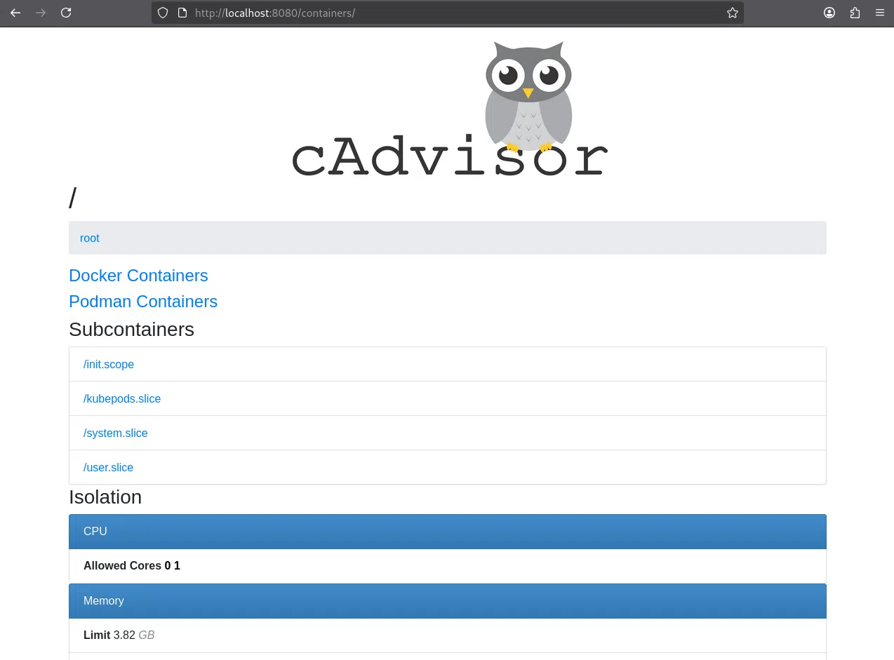 3632782af29a gcr.io/cadvisor/cadvisor:v0.52.1 "/usr/bin/cadvisor -…" 6 minutes ago Up 6 minutes (healthy) 0.0.0.0:8080->8080/tcp, :::8080->8080/tcp cadvisor