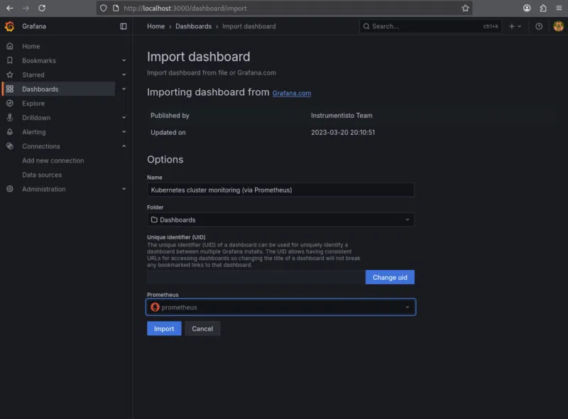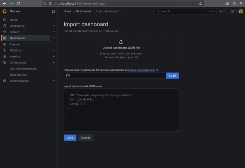 - Nous saisissons l’ID du tableau de bord que nous souhaitons importer, par exemple 315, un modèle générique et efficace pour la supervision Kubernetes
