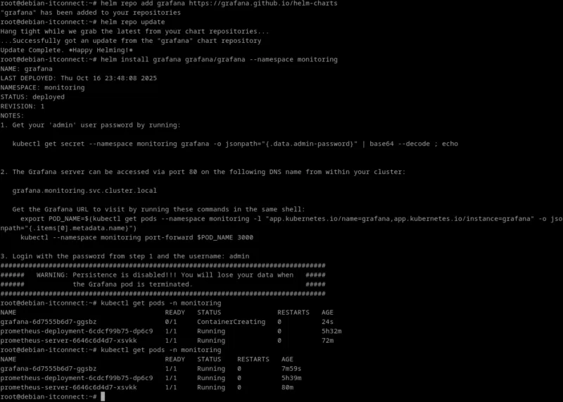 Lorsque le pod grafana-xxxxx affiche STATUS = Running, l’installation est réussie.