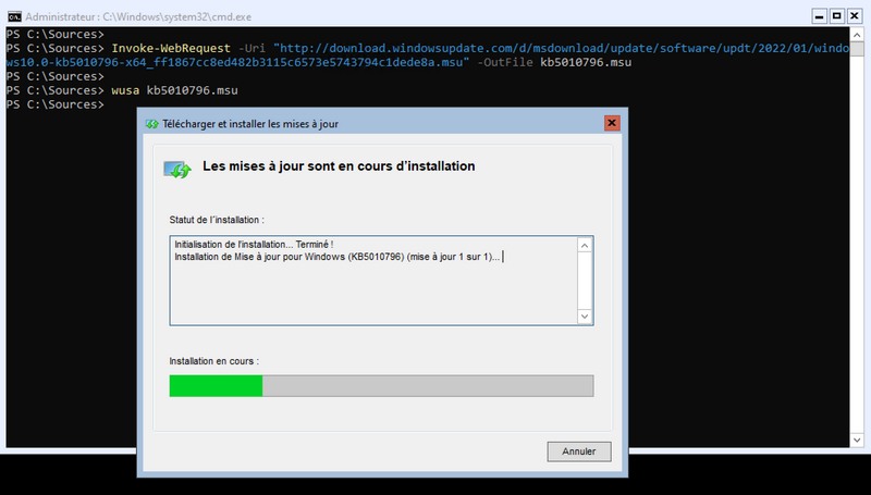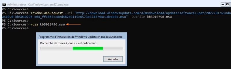 À partir de la ligne de commande, on peut installer manuellement une mise à jour via l'utilitaire "wusa" voire même désinstaller une mise à jour via cet utilitaire (ce qui est utile lorsque des effets de bords sont constatés suite à l'installation d'une mise à jour).