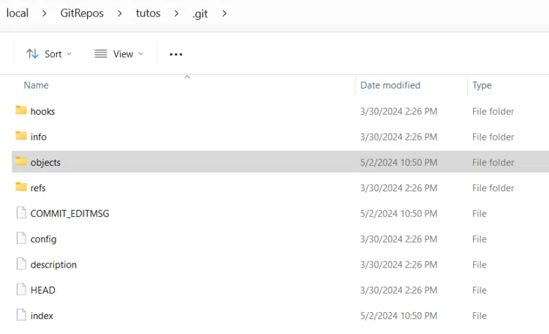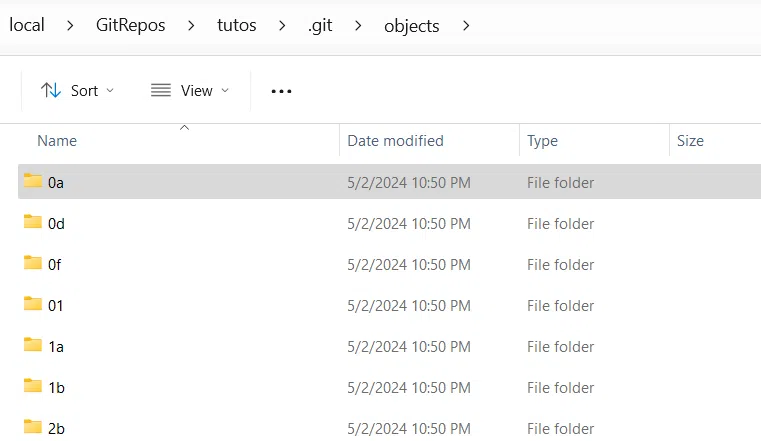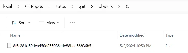 Comme on peut le voir sur l'illustration précédente, chaque commit est représenté par une chaîne de (40) caractères en hexadécimal obtenue grâce à la fonction de hachage SHA-1 (Secure Hash Algorithm) qui est générée lors de l'exécution de la commande « git commit -m ». Ce hash est l’identifiant unique de chaque commit et il est stocké dans la base de données objet qui est située dans le répertoire « /objects » sous « /.git ». Voici un exemple de ce répertoire sous Windows en mode graphique :