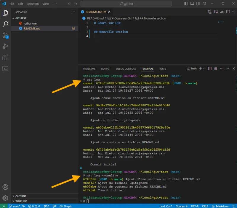La capture suivante montre la sortie des deux versions de la commande « git log » :