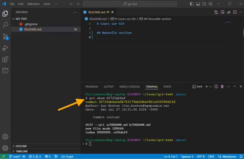 Pour consulter un commit spécifique, vous pouvez utiliser la commande « git show » avec les premiers caractères du hash. Voici un exemple qui affiche les détails du « Commit initial » commençant par 6f725ab6af :