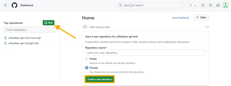 Pour en faire l'essai, créons un nouveau dépôt sur GitHub que nous nommerons « git-test ». Dans votre « Home » sur GitHub, appuyez sur « New » ou « Create a new repository » :