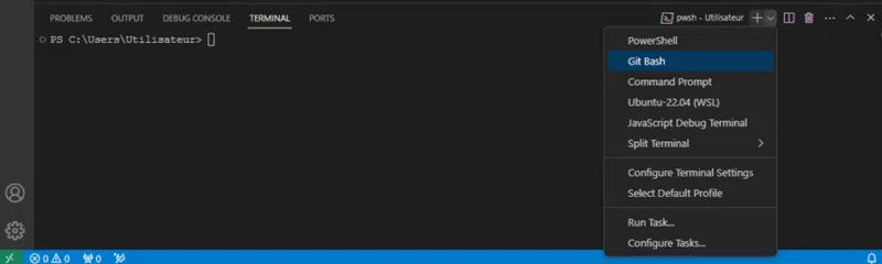 Dans le terminal qui s’ouvre dans la section du bas, ouvrez le menu après Utilisateur « + » à droite et sélectionnez « Git Bash ».