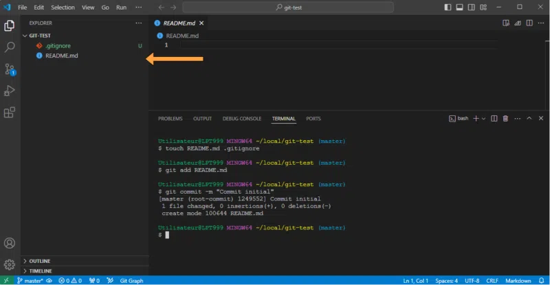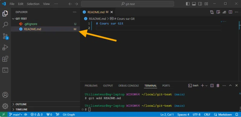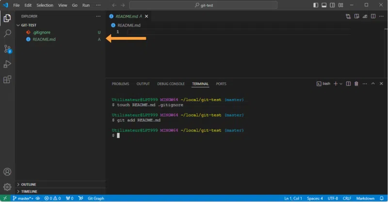 Dans VS Code, nous voyons qu'un « A » (pour « ajouté ») a remplacé le « U » à droite du fichier « README.md » (comme dans la version courte de git status). Notons aussi que Git nous indique qu'il y a un fichier non suivi (« Untracked file ») qui correspond au « .gitignore » que nous n'avons pas ajouté encore à l'espace de staging.