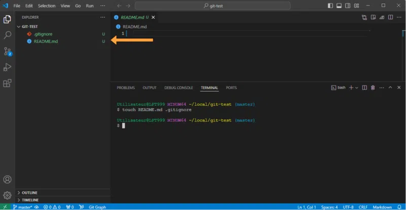 Commençons par créer deux fichiers que nous retrouvons très souvent dans des dépôts Git : « README.md » et « .gitignore ». Nous reviendrons plus loin sur le rôle de ces deux fichiers.