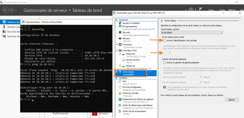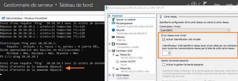 Suite à cette modification, l'hôte Hyper-V et la VM peuvent de nouveau communiquer, tout en étant virtuellement sur le VLAN 10 !