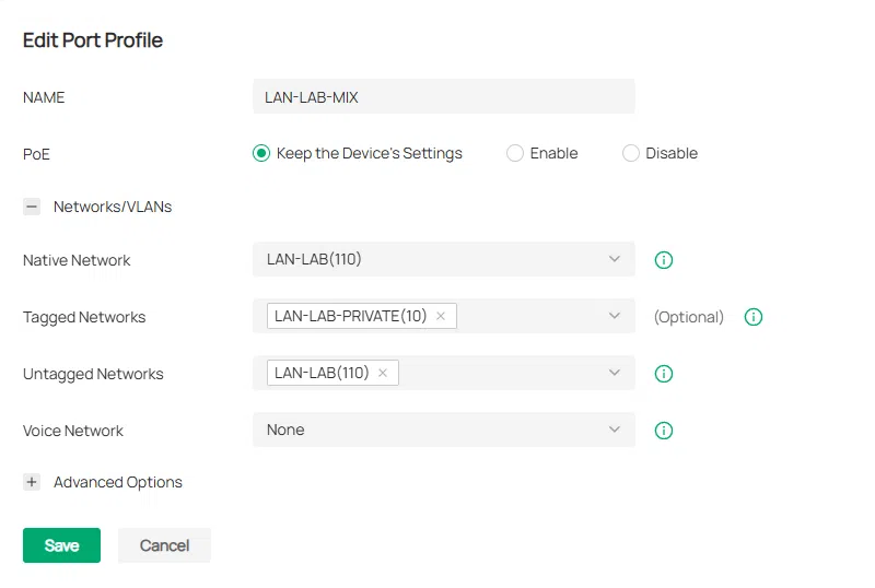 Voici un exemple de profil de configuration destiné à être appliqué sur le port d'un switch. Cette configuration signifie que si une machine virtuelle est connectée sur ce port de switch, elle sera par défaut sur le VLAN 110 nommé LAN-LAB. Si l'on veut que la machine virtuelle soit connectée sur le VLAN LAN-LAB-PRIVATE (ID 10) taggué sur ce port, il faudra aussi ajouter le tag sur la carte réseau de la VM.