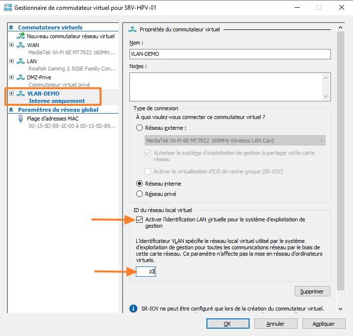 Ce qu'il faut retenir, c'est que la modification directement au niveau du commutateur virtuel affecte uniquement l'Hyper-V et non les VM connectée au commutateur virtuel. Pour les VM, vous devez gérer la configuration au niveau de la carte réseau de la VM.
