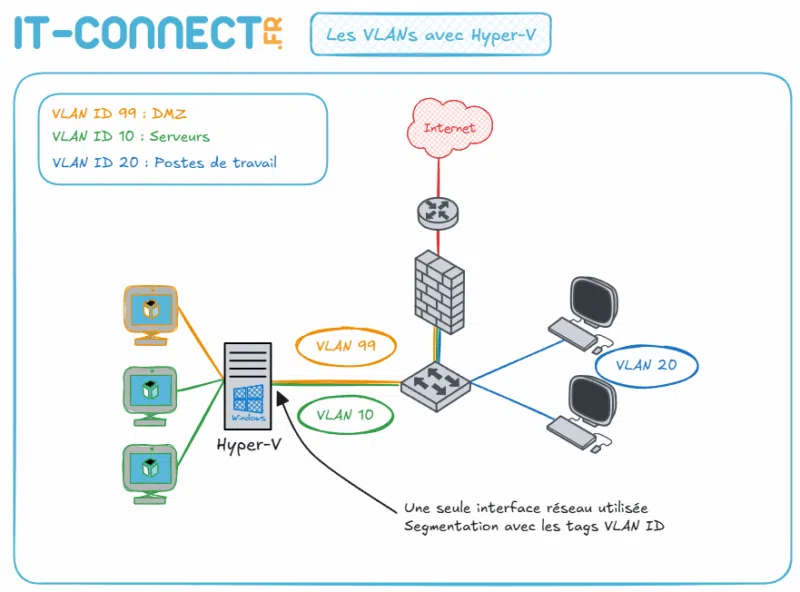 La configuration des VLAN dans Hyper-V est opération fréquente pour gérer le trafic réseau des machines virtuelles, que ce soit pour cloisonner les services (production, tests, etc.) ou refléter une architecture réseau existante au niveau des machines virtuelles.