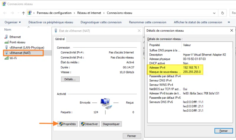 Pour atteindre notre objectif, nous allons devoir créer un nouveau commutateur virtuel "Interne" au sein de la console Hyper-V. Ensuite, nous devons associer une adresse IP sur cette interface virtuelle afin qu'elle soit utilisée comme passerelle par les machines présentes dans le réseau virtuel NAT. Puis, nous devons configurer un nouveau réseau NAT sur notre hyperviseur, en l'occurrence, ici le réseau "192.168.76.0/24" sera utilisé pour les machines. Enfin, nous finirons par connecter une VM sur ce nouveau switch virtuel afin de tester la configuration.