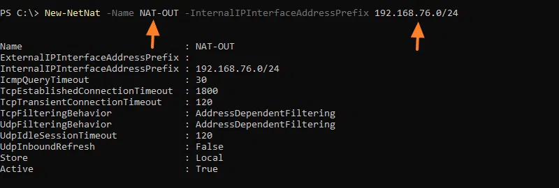 New-NetNat -Name NAT-OUT -InternalIPInterfaceAddressPrefix 192.168.76.0/24