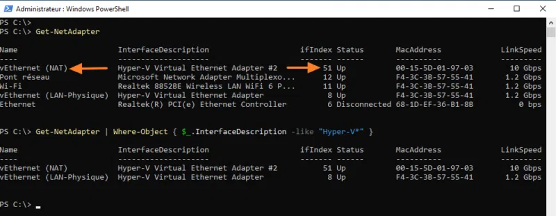 Nous devons attribuer une adresse IP à l'interface réseau associée au nouveau commutateur virtuel que nous venons de créer. Grâce à la commande Get-NetAdapter, nous pouvons lister les interfaces réseau disponibles sur la machine locale.