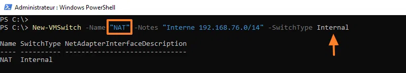 New-VMSwitch -Name "NAT" -Notes "Interne - NAT 192.168.76.0/24" -SwitchType Internal