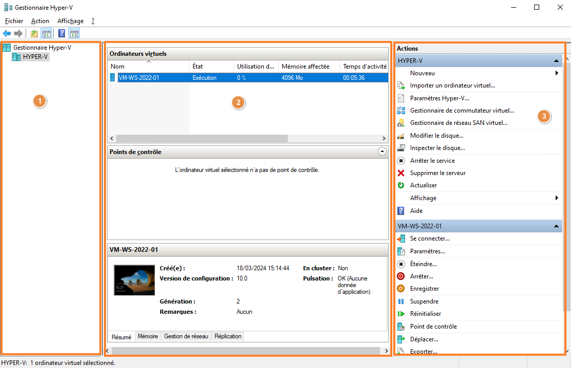 3 - La liste de toutes les actions disponibles, que ce soit au niveau de l'hôte Hyper-V sélectionné en lui-même (partie supérieure), qu'au niveau de la machine virtuelle. Les actions pour l'élément sélectionné sont également accessibles via le menu "Action" présent dans le menu supérieur de la console, ou via un clic droit sur un ordinateur virtuel ou un hyperviseur.