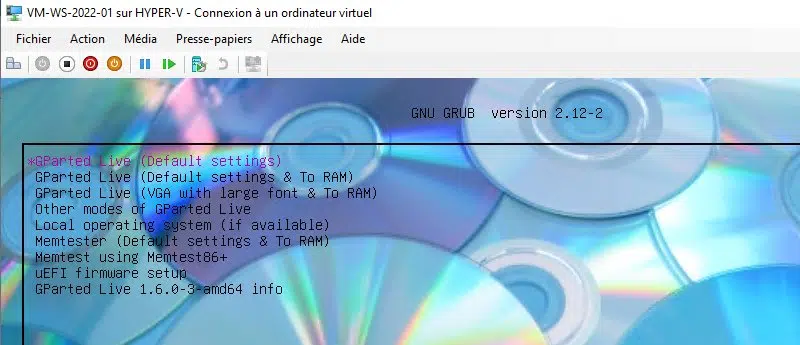 Nous allons devoir booter sur cette image ISO qui est en fait un Live CD avec l'outil Gparted prêt à l'emploi. Insérez l'image ISO de Gparted dans le lecteur DVD virtuel de la VM.
