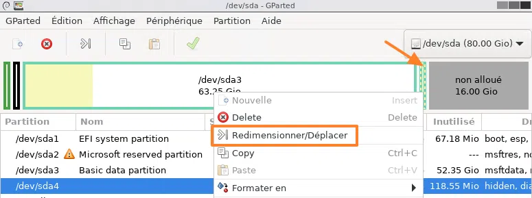 - Redimensionner la partition principale (/dev/sda3) pour qu'elle s'étende sur l'espace non alloué.
