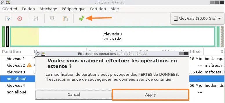 À titre d'information, voici à quoi doit ressembler le partitionnement du disque au moment où vous allez valider l'opération.