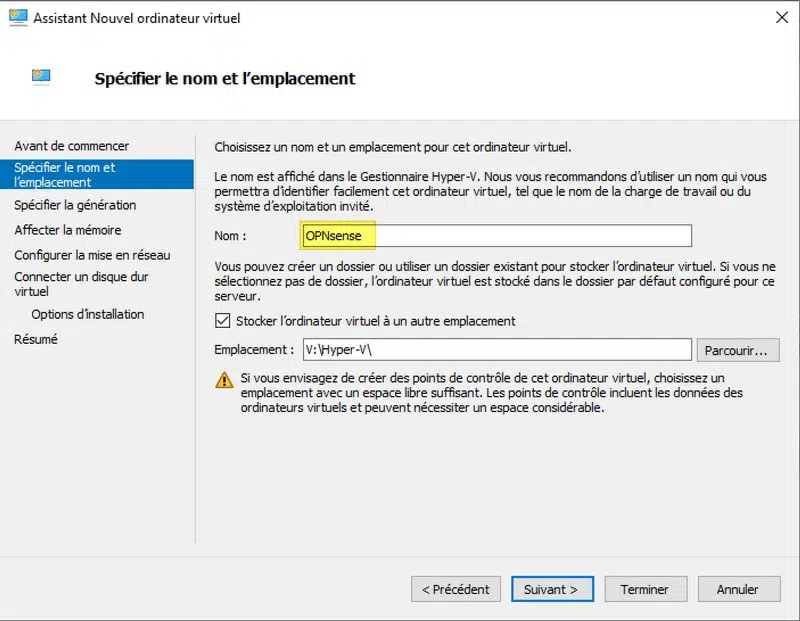 À partir du "Gestionnaire Hyper-V", créez un nouvel ordinateur virtuel. Nommez cette VM, par exemple "OPNsense", tout simplement.