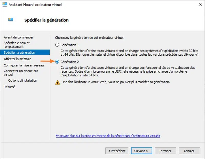 Choisissez la "Génération 2" car OPNsense est compatible avec cette configuration, bien qu'il supporte aussi la génération 1.