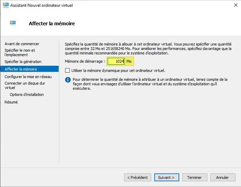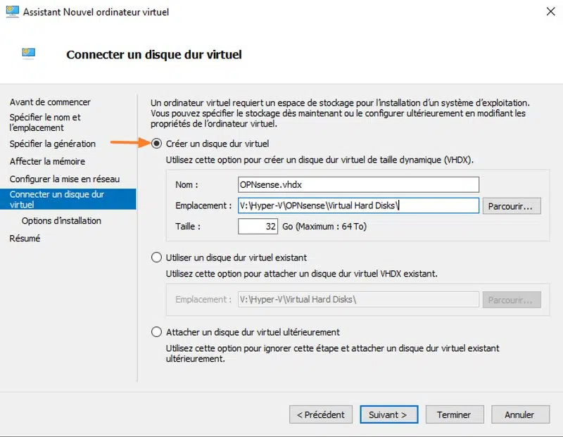 Choisissez de créer un nouveau disque virtuel pour cette VM. Vous pouvez indiquer 32 Go ou une taille supérieure, le minimum recommandé étant 8 Go. Pour rappel, ce disque virtuel sera alloué de façon dynamique, donc la taille du fichier VHDX va grossir au fur et à mesure que l'espace disque est consommé dans la VM.
