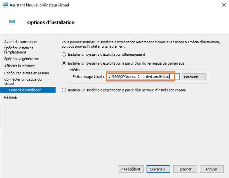 Pour finir, spécifiez le chemin vers l'image ISO d'OPNsense téléchargée précédemment.
