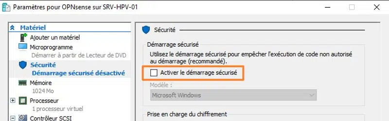 Pour finir, cliquez sur l'onglet "Sécurité" afin de désactiver le démarrage sécurisé, sinon la VM ne fonctionnera pas.
