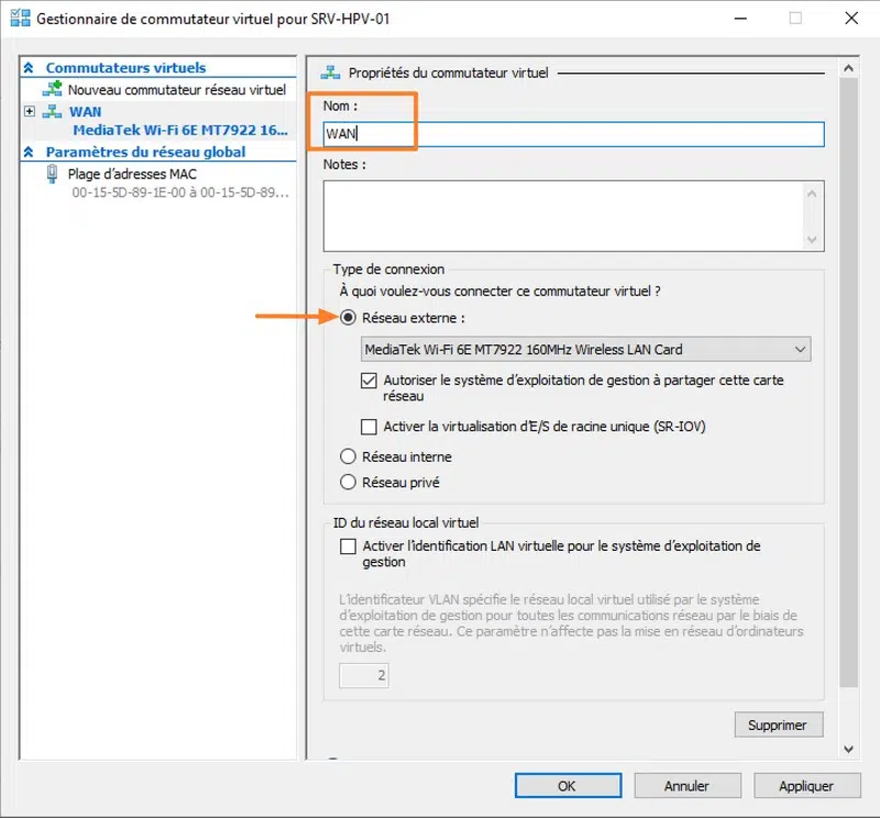 - Un commutateur virtuel de type "Externe" qui sera utilisé pour l'interface WAN du firewall OPNsense. Il doit être associé à la carte réseau physique connectée au réseau local, afin de fournir un accès à Internet. Pour ma part, il s'agit d'un switch virtuel nommé "WAN".
