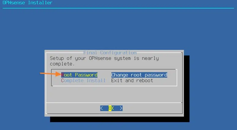 Une fois l'installation terminée, nous pouvons de changer le mot de passe "root" avant de redémarrer. Sélectionnez "Root Password", appuyez sur Entrée et indiquez un mot de passe "root" par deux fois.
