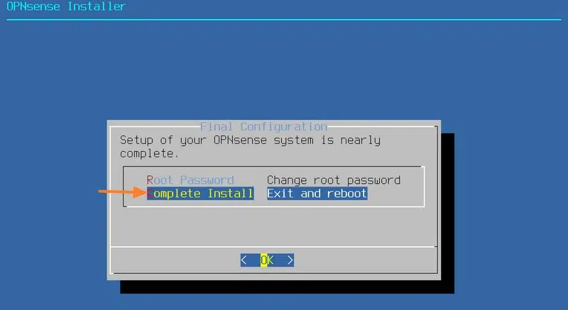 Enfin, sélectionnez "Complete Install" et appuyez sur Entrée. Profitez-en pour éjecter le disque du lecteur DVD de la VM. Dans les paramètres de la VM, vous pouvez aussi positionner en premier le démarrage sur le disque.