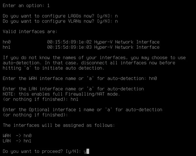 D'abord, l'assistant propose de configurer une agrégation de liens et des VLANs, indiquez "n" pour refuser, et à chaque fois, validez votre réponse avec Entrée. Ensuite, vous devez affecter les deux interfaces : "hn0" et "hn1" au WAN et au LAN. En principe, "hn0" correspond au WAN et l'autre interface au LAN.