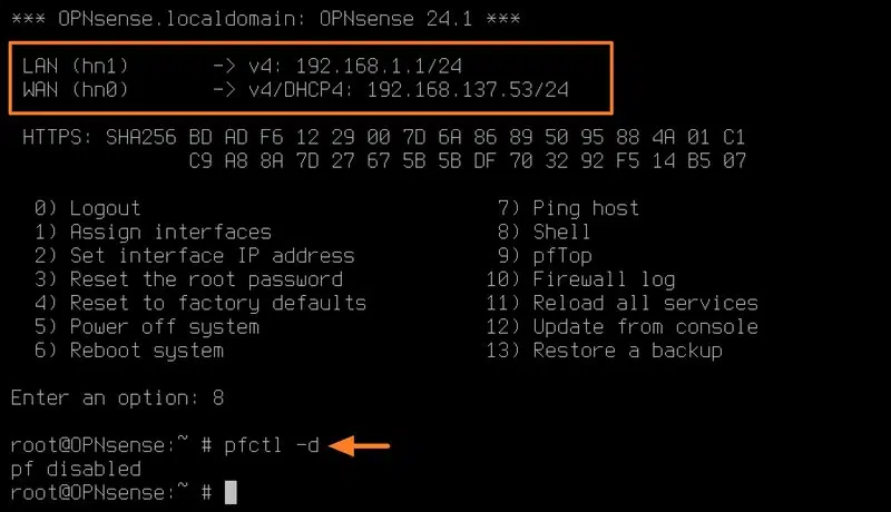 Cette commande sert à désactiver temporairement le firewall d'OPNsense. Par exemple, un simple redémarrage d'OPNsense réactivera les règles et la fonction de firewall.