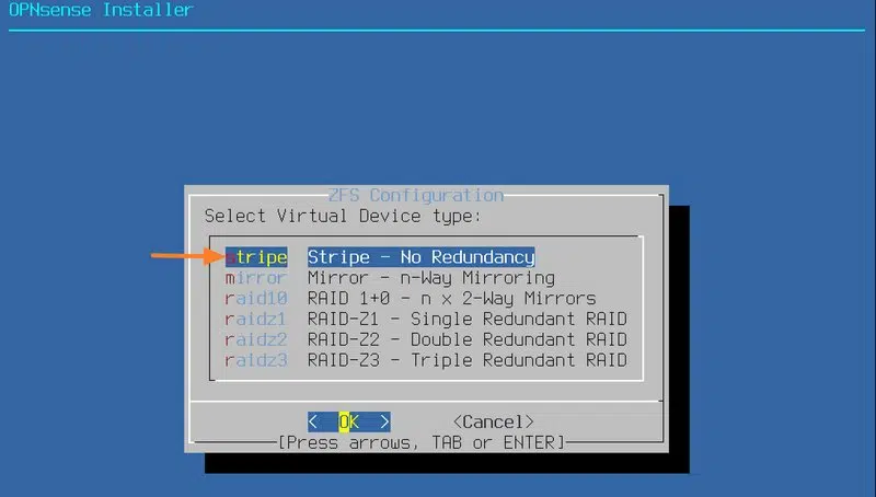 À la troisième étape, sélectionnez "stripe" puisque notre machine est équipée d'un seul disque : il n'y a pas de redondance possible pour sécuriser le stockage du firewall et ses données. Ceci est surtout pertinent lors de l'installation sur une machine physique pour se prémunir contre une panne matérielle d'un disque, via le principe du RAID.